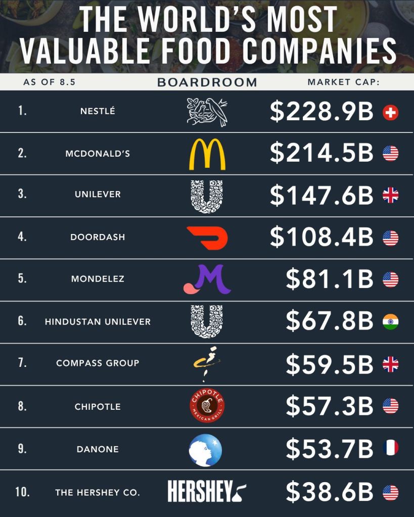 It’s not surprising to see Nestlé and Unilever on Boardroom’s “The World’s Most Valuable Food Companies.” But McDonald’s and DoorDash? 🤯 They completely caught me by surprise because their business models are so different, and yet they still got to the top of the list with over a $100 billion market cap!